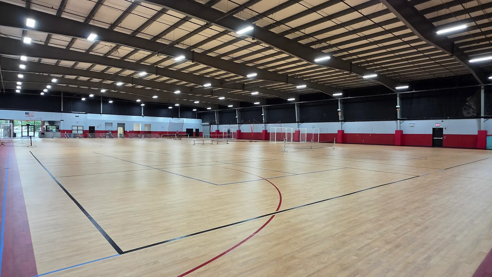 The sport court is nearly 20,000 sq. ft. of versatile floor space. The “terra-flex” synthetic rubber surface is permanently lined for three futsal courts, six volleyball courts, and three pickleball courts (additional PB courts are lined with heavy duty floor tape).